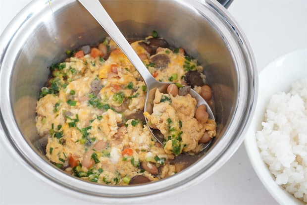 ご飯にのせずに、器に盛れば「こだわりやさい豆の卵とじ」として立派なおかずに。汁気を少し切ればお弁当の隙間埋めにもぴったり!