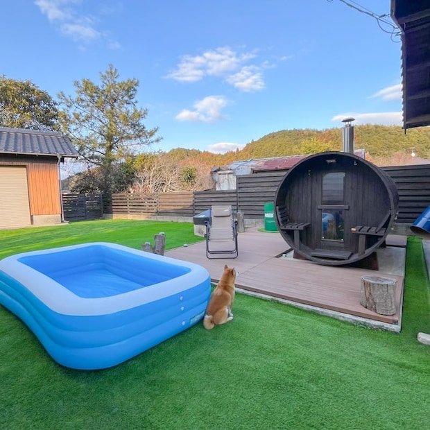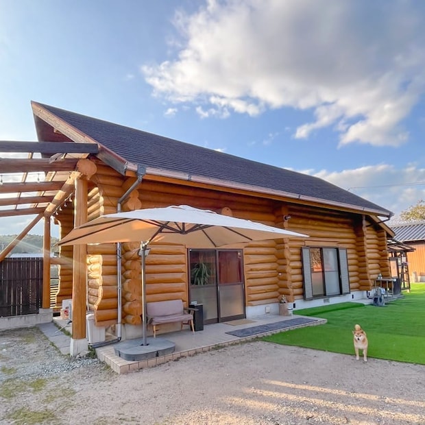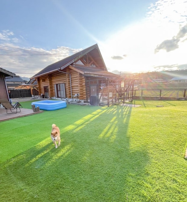 中に入ると広々とした敷地に大きなログハウスが!「ログハウス HOKA」は愛犬と一緒に泊まることができる、サウナ付きの貸切り民泊です。