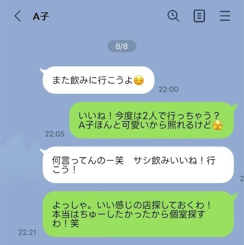 別に誰と飲みに行くとか詮索しないのでいいのですが、LINEの内容が夫から「(御相手の名前)かわいかった」「ほんとはちゅーしたかった」など送っていました。