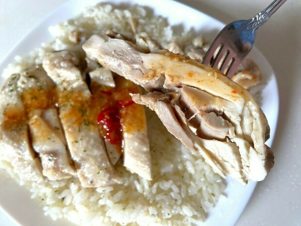 これは鶏のゆで汁で炊いたご飯にゆで鶏を乗せたシンガポールの名物料理で、フタを開けると鶏肉が敷き詰められており、ずっしりとした重みがあります。