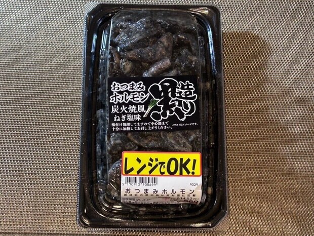 真っ黒すぎて目を引くこちらは豚のホルモンを使った「おつまみホルモン炭火焼風」です。