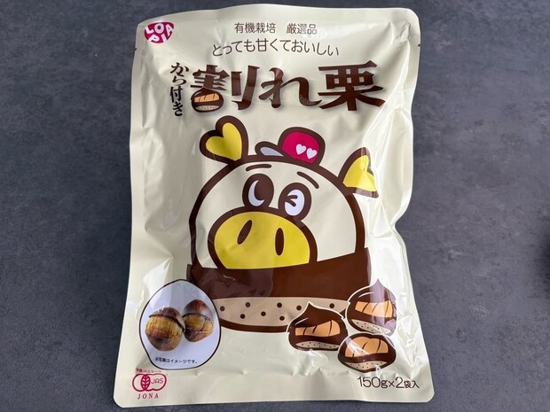 ロピタくんがドーンと描かれた焼き栗は、150gの小袋が2つ入った小分けタイプ。