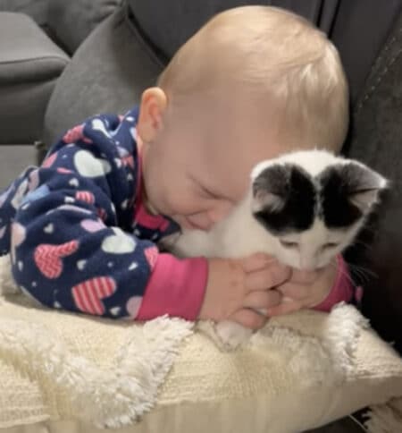 赤ちゃんが突然子猫さんの背中にキス!