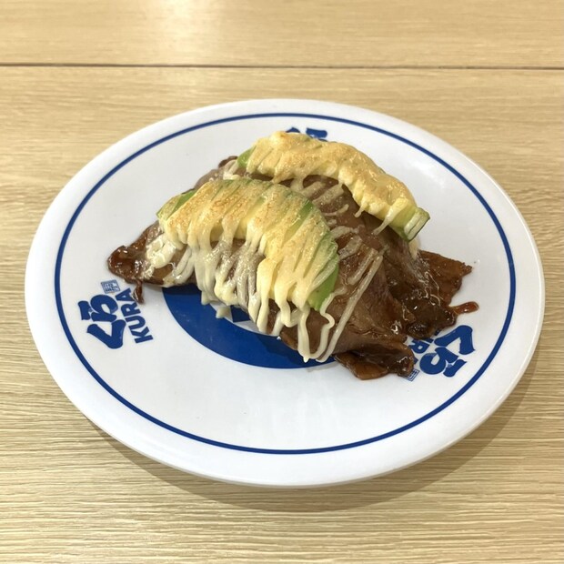 イベリコ豚の中でも最高ランクの“ベジョータ”を使用。くら寿司特製チーズマヨネーズソースとアボカドをトッピングした、濃厚な味わい。