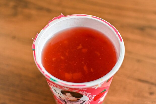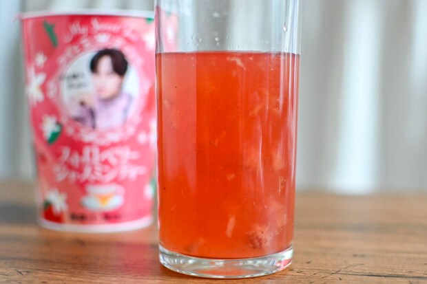 ひと口目からたっぷりと入ったストロベリー果肉の果肉感を味わえるのとともに、ジャスミンティーのさわやかな香りとストロベリーの華やかな甘みを楽しめます。