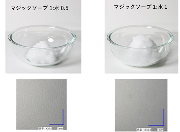 マジックソープに合わせる水の量を変えるだけで、泡の質が変わります。1:1の方が良く泡立つだけでなく、きめが細かく濃密な泡になります。