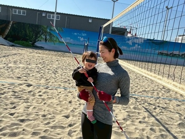 溝江明香さん、ビーチバレーコートで子どもと一緒に