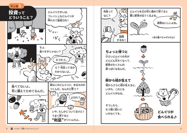 「利息」について説明した導入マンガ。「貯蓄」や「投資」の勉強に抵抗がある子どもたちも楽しく学べる工夫を