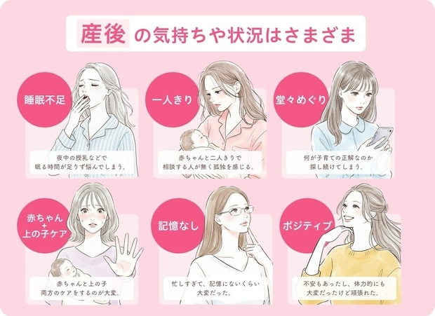 自由回答を分析してみると、産後の女性の多様な悩みが顕在化しました。そんな女性の悩みをタイプ別に紹介しています。