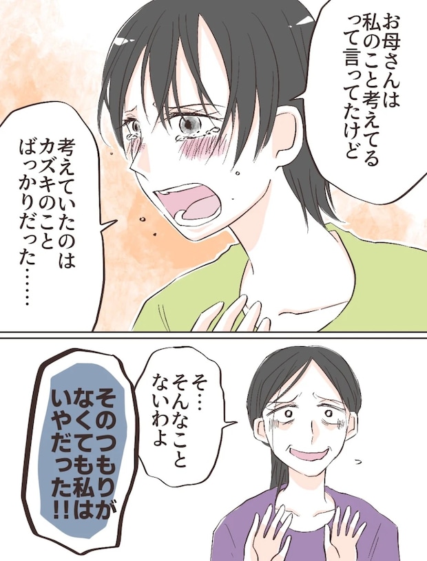 母は、私が言うことを聞かないと分かると焦り始め、「こんな人とお付き合いしたからおかしい考えになっちゃったの?」と震えながら言いました。私は母の手を払うと「お母さん、いつもカズキばっかりが優先で、私はやりたいことやらせてもらえなかったよね」と今まで思っていたことを話しました。