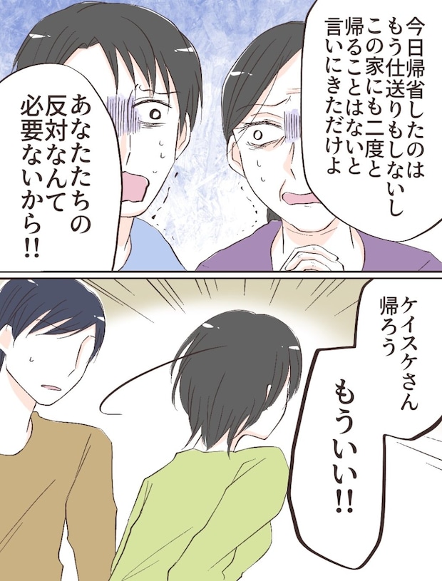 「今日帰省したのは、もう仕送りもしないし、この家にも二度と帰ることはないって言いにきただけ」はじめから反対されることは分かっていたので、はなから許可なんてもらうつもりはありませんでした。予想はしていたけどここまで話が通じないなら仕方がない。私はケイスケさんの手を引いて、家を後にしました。