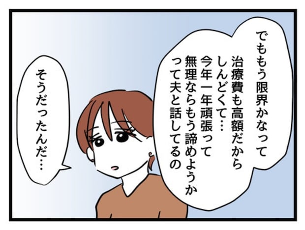 不妊治療がうまくいかないイラ立ちから、周囲への不満を抱えていた、キリコ。相手に対して「配慮」を求めてばかり。