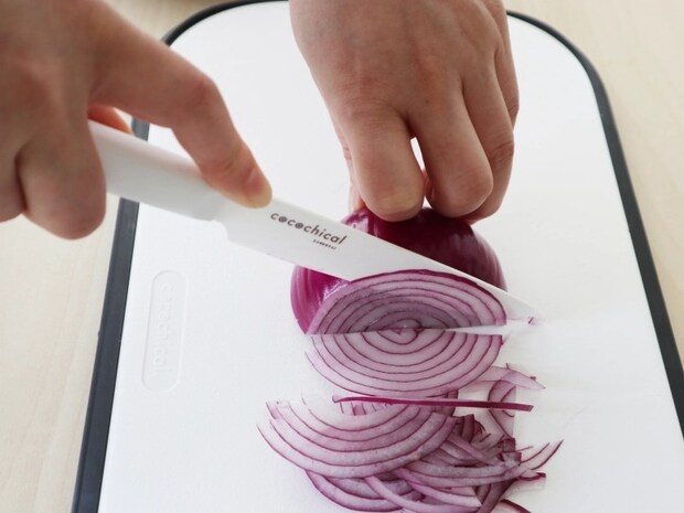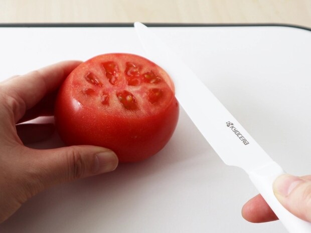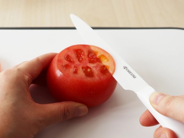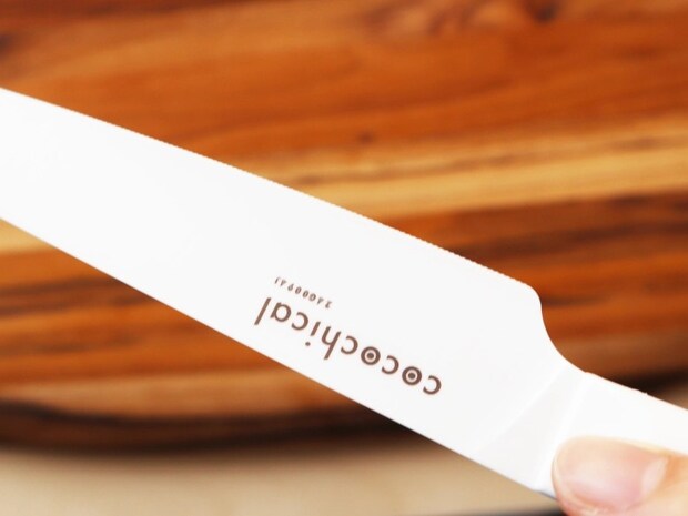 『cocochicalセラミックナイフ スライス』は、京セラ独自の特許取得の新素材刃<Z212>を採用。さらにノコギリ状のマイクロギザ刃のデザインなので、食材への刃入れのキャッチ力が抜群で、つるつる食材に“チュン”と刃が吸い込まれるように入り、スーーーっと切れていきます。