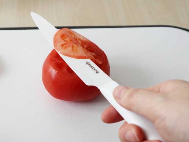 しかも、12.5cmとコンパクトサイズで軽いファインセラミックスなので、ステンレス製の三徳包丁よりも小回りがききやすく、いつもより細かく包丁を扱えます。薄めで硬いため、食材に狙いを定めて刃をあてやすく、切り幅を調整しやすいんです。よく切れるスリムコンパクトサイズのこのナイフはプロの厨房でもよく使われており、子ども用やフルーツ用ではなく大人のための包丁と言えます。
