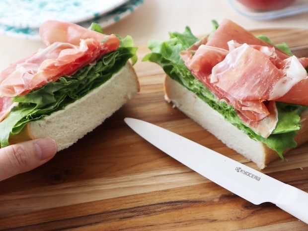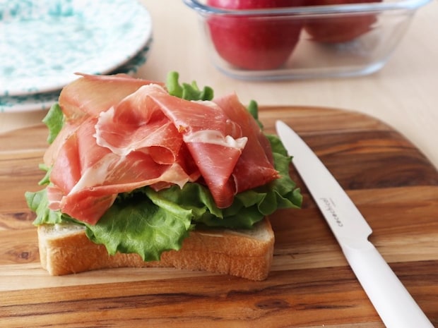 ふんわりした生ハムとフリルレタスと厚切り食パンのオープンサンドも、エアリーカットでふわっとした切れ味が実現! 12.5cmのコンパクトスリムサイズだから、サッと使えて便利です。