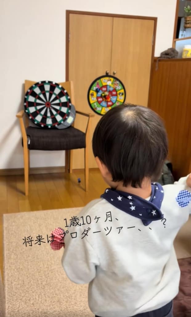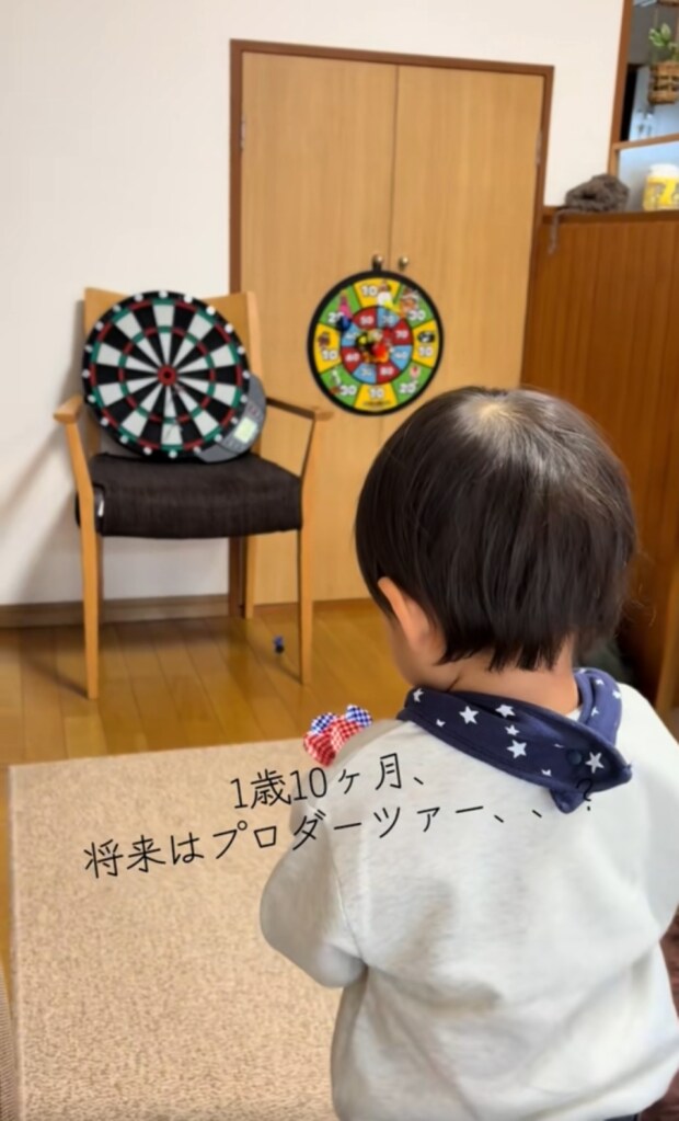 ダーツで遊んでいる赤ちゃん。なんと、的に刺さるほどの命中力……! いったい何歳で始めたのでしょうか?