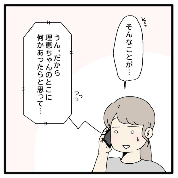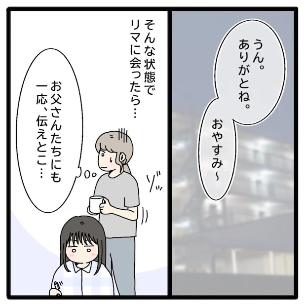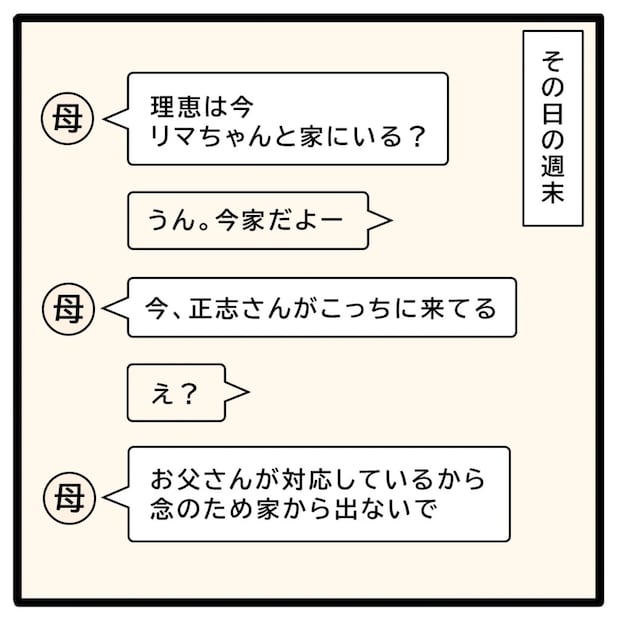 美沙ちゃんが恐れていた事態は、思っていたよりも早く訪れました。その日の週末、母から「理恵は今、リマちゃんと家にいる?」と連絡が。私が「家だよ」と返信すると、続けて届いたのは「今、正志さんがこっちに来てる、お父さんが対応しているから念のため家から出ないで」という目を疑う内容でした。