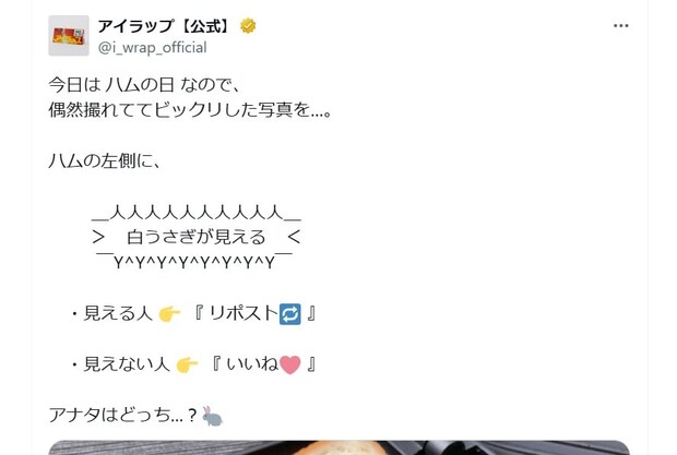 公式アカウントは「今日はハムの日 なので、偶然撮れててビックリした写真を…」と投稿。その上で「ハムの左側に、白ウサギが見える」と紹介しています。