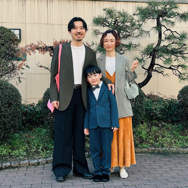 3人で並んだ時も、両親は少しカジュアルダウンしたことで息子の主役感が際立ちます。そして夫婦でカラーリンクすることで仲良し感も演出….!(できてますかね…?笑)