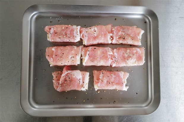 2. 豚肉を広げて両面に塩、こしょうを振り、片面に薄力粉をまぶす。薄力粉をまぶした面で凍み豆腐を巻く。