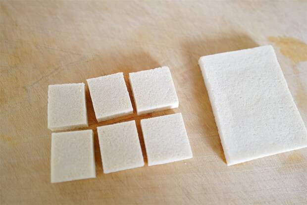 1. 凍み豆腐はお湯に浸して十分に戻した後、よく水気を絞り1枚を6等分にする。