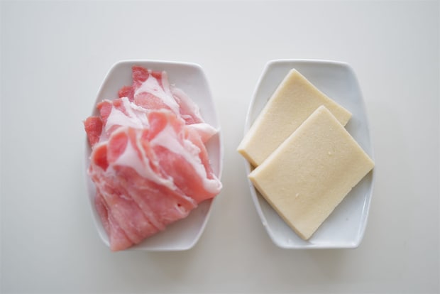 今回作るのは、豚の薄切り肉で凍み豆腐を巻いた「凍み豆腐入りとんかつ」ですが、豚肉のエキスを凍み豆腐がたっぷり吸ってくれそうな予感♪ 期待を込めて、クッキングスタートです!