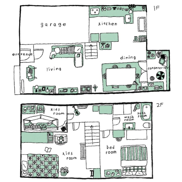 自然派のローラさんらしく、部屋のあちこちに貝殻などのネイチャーを彷彿とさせるものが置かれている。母親から譲り受けた花器の色に合わせて、フォレストくんがつくったブルーのレゴの飛行機をディスプレイ。細部にまで行き届いたカラーコーディネートはさすが。