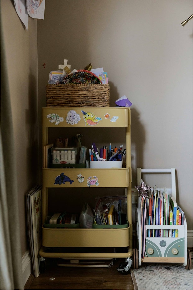 ダイニングテーブルの脇には、文房具とクラフト用具を収納できる〈IKEA〉のキャスター付きワゴンを設置。「子どもたちの創作意欲が湧いたとき、すぐに手の届く場所にあるから便利なんです」