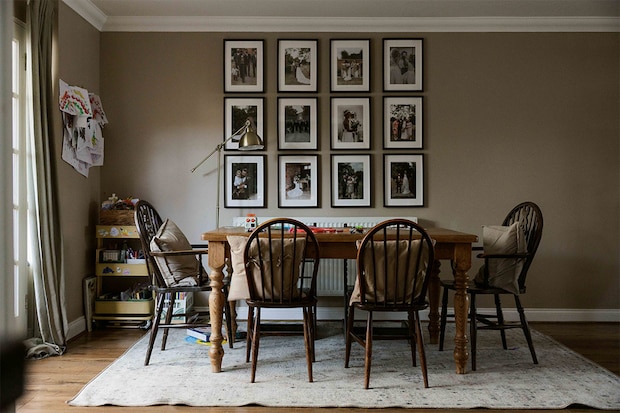 ダイニングスペースは、リビング、キッチン、プレイルームの中央に位置する、家族全員のお気に入りの場所。ジョーさんとローラさんの結婚式の写真を額に入れて整然と壁一面に並べ、まるでギャラリーのような印象に残る空間に。