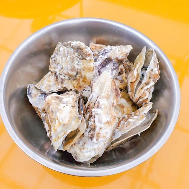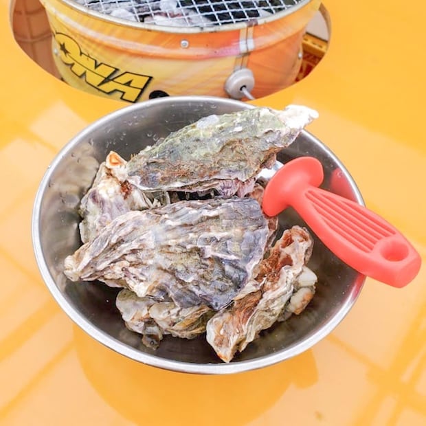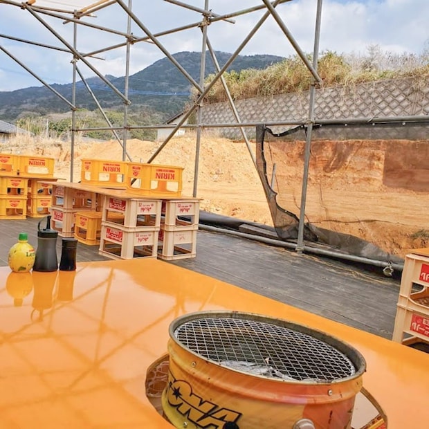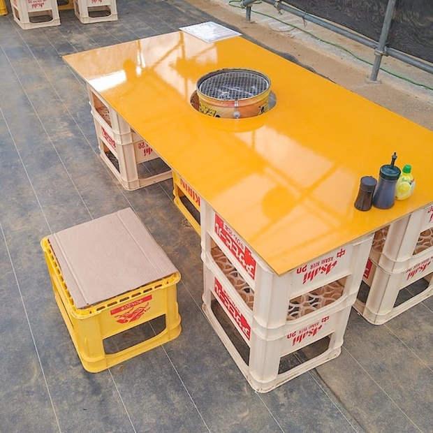 並べられたテーブル席とコンテナ椅子が、キャンプに来たかのようなワクワク感を演出し、炭火を囲んで牡蠣を焼く光景が自然と目に浮かんできそう。