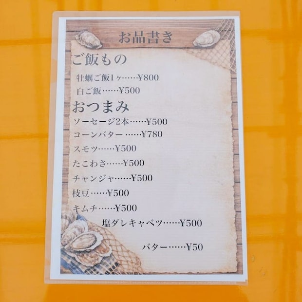 席に着いてまず目に入ったのは、牡蠣をモチーフにした温かみのあるデザインのお品書き。