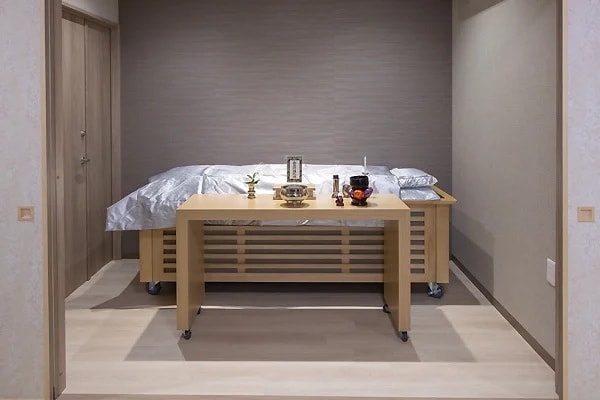 「はないろ今里店」は、定員15名まで対応の小規模葬儀会場で、1日1組限定の貸切利用が可能。周囲を気にすることなく、家族だけでゆっくりと故人を見送ることができる。