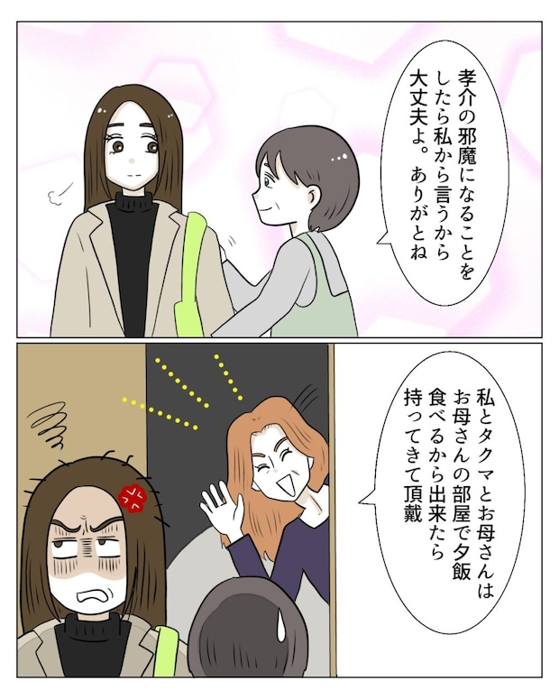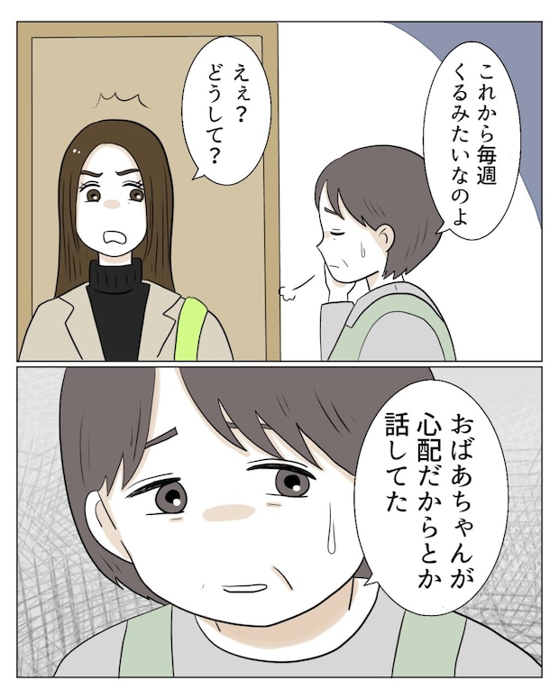 「これから毎週来るみたいなのよ」ため息まじりにそう話すと、真矢は顔を歪めて「えぇ?どうして?」と聞き返してきました。「おばあちゃんが心配だからとか話してた」そう伝えはしたものの、私はなんとなく、エミさんとタクマくんの狙いは別にあるのではないかと思いました。