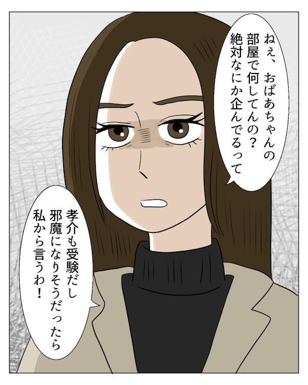 すると真矢は眉をひそめて、「ねぇ、おばあちゃんの部屋で何してんの?絶対なにか企んでるって」と怪訝そうな表情で言いました。さらに続けて「孝介も受験だし、邪魔になりそうだったら私から言うわ!」と力強く言ってくれたのです。