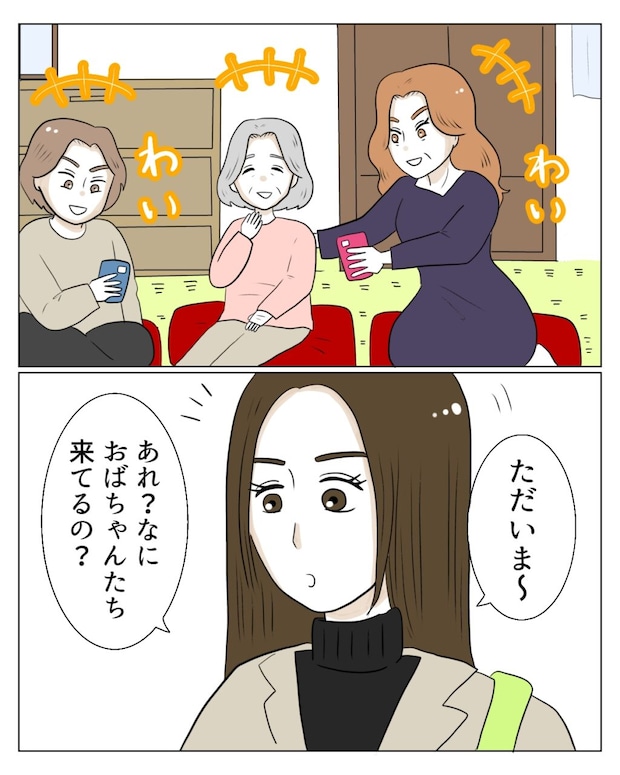 義母の部屋にこもって、エミさんとタクマくんが楽しく会話していると、真矢が帰ってきました。玄関に並ぶ靴を見た真矢は「あれ?なにおばちゃんたち来てるの?」と私に聞いてきました。