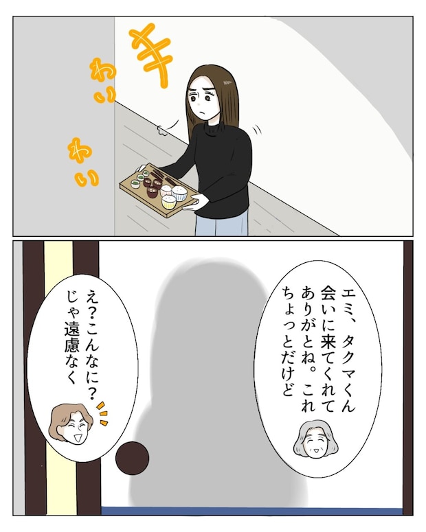 エミさんとタクマくんが毎週来る理由がここに隠されているようですね。お義母さんは会いに来てくれるのは嬉しいとは思いますが、一緒に住んでいる家族のことも考えないと溝はより深くなっていくでしょうね。