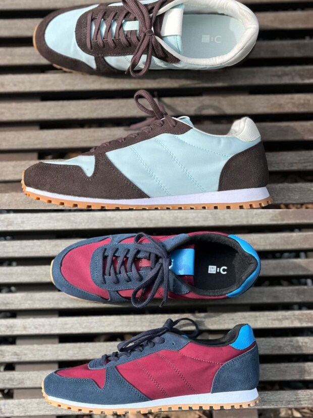 「コンビネーションスニーカー」はレトロクラシックなルックスなので、想像以上に取り入れやすかったです。まず、ワイン×ネイビーはネイビーコーデに合わせてみたのですが、統一感あるカラーリングのおかげでカジュアルすぎず、大人っぽいスニーカースタイルに仕上がりました。一方、ライトグリーン×ブラウンは淡いピンクのパンツとスタイリング。ちょっと相性が悪いかな? とも思ったのですが、ブラウンが絶妙な引き締め役になってくれました。なので、ライトトーン同士の合わせもバランスがよく、春全開の着こなしに。
