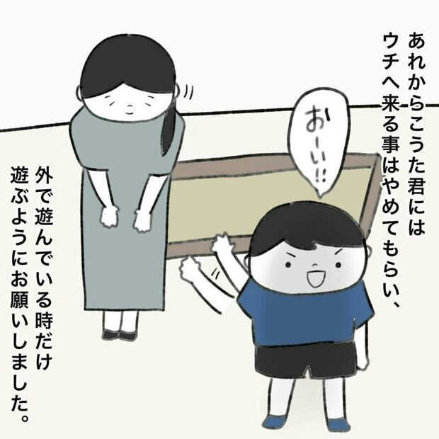 毎日、ドアを激しくたたいて遊びに来ていたこうたくん。さらに、犬を連れて勝手に家に入られることもありました。わが子に対するイジワルやワガママもエスカレートしていました。ようやく、適切な距離をおいたことで、平穏が訪れたといいます。