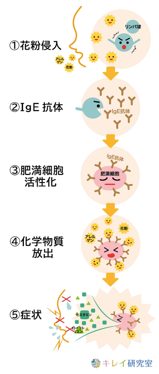 鼻や目から花粉が体内に入ると、体の中で「IgE抗体」という物質が作られます。