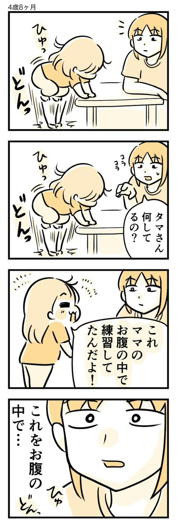 目の前で娘さんが見せている光景が、かつておなかの中で行われていたと思うと、「母は強し…」と改めて感じてしまいますね。子育ての大変さと面白さがユーモアたっぷりに表現された、素敵な漫画でした!