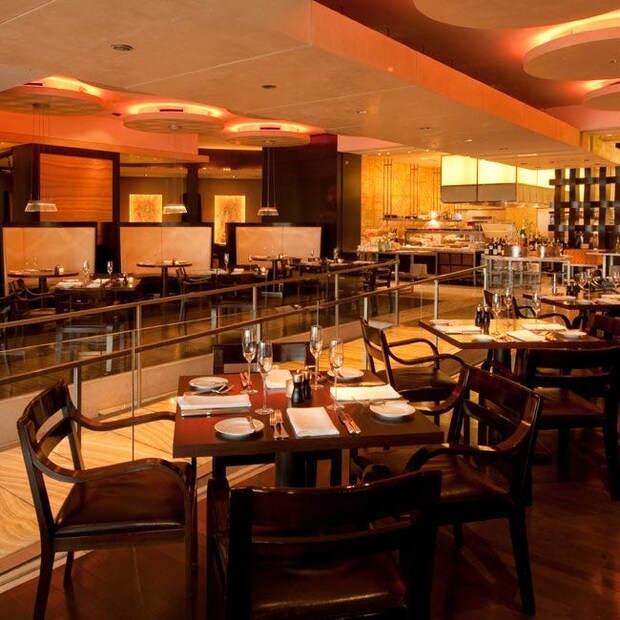 会場はグランド ハイアット 東京内にあるオールデイ ダイニング「フレンチ キッチン」。舞台のようなオープンキッチンとキャットウォークが華やかな雰囲気を演出。ショーの観客気分で、スタイリッシュなフレンチを堪能して。
