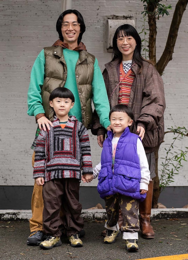 アースカラーをベースに、グリーンやパープル、レッドの挿し色が冬の街に映える家族コーデ。柄×柄のレイヤードやヴィンテージアイテムを取り入れて、オリジナリティを発揮したのがポイント。