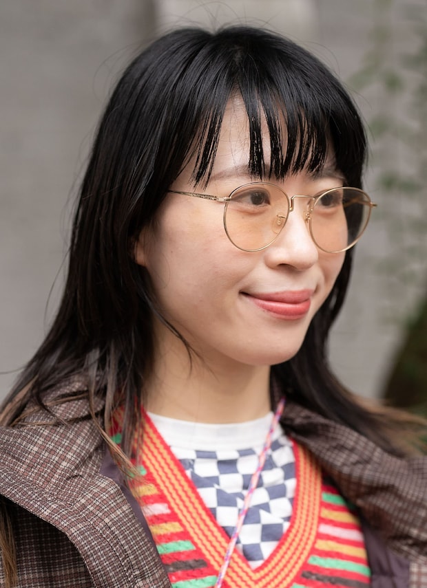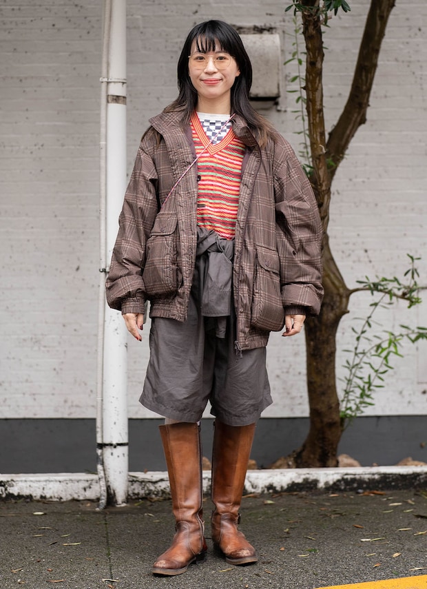 チェッカー柄のトップスにボーダーのベストを重ねて、顔まわりを華やかに彩るテクニックが光る。ゴールドフレームのメガネで程よく引き締めたのがグッド!