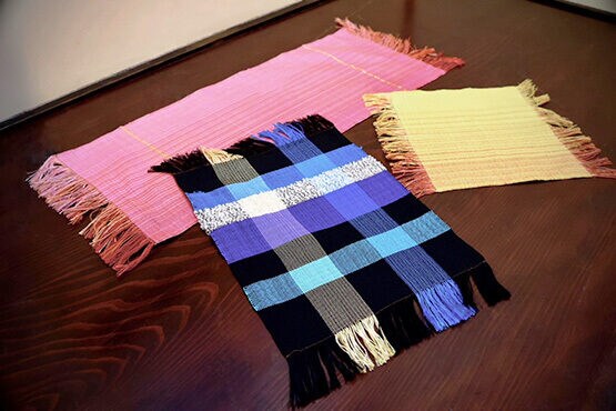 好きな色の絹糸が張られた織機に座り、トントンとリズムよく織り進めれば、ランチョンマットやストールなど、すてきな作品が完成。