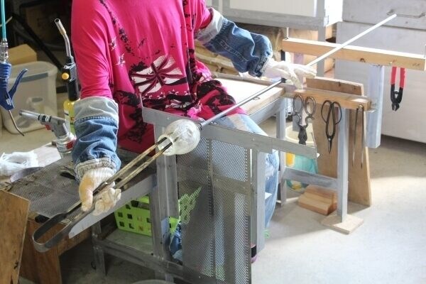 工房の設備は、必要な機能を備えつつ省エネルギーを意識しており、リサイクルガラスも活用。吹きガラスの体験では、自分で色などを選び、オリジナルのグラスや一輪挿しを作ることができます。ぜひお子さんと創作の楽しさを体験してみてください。