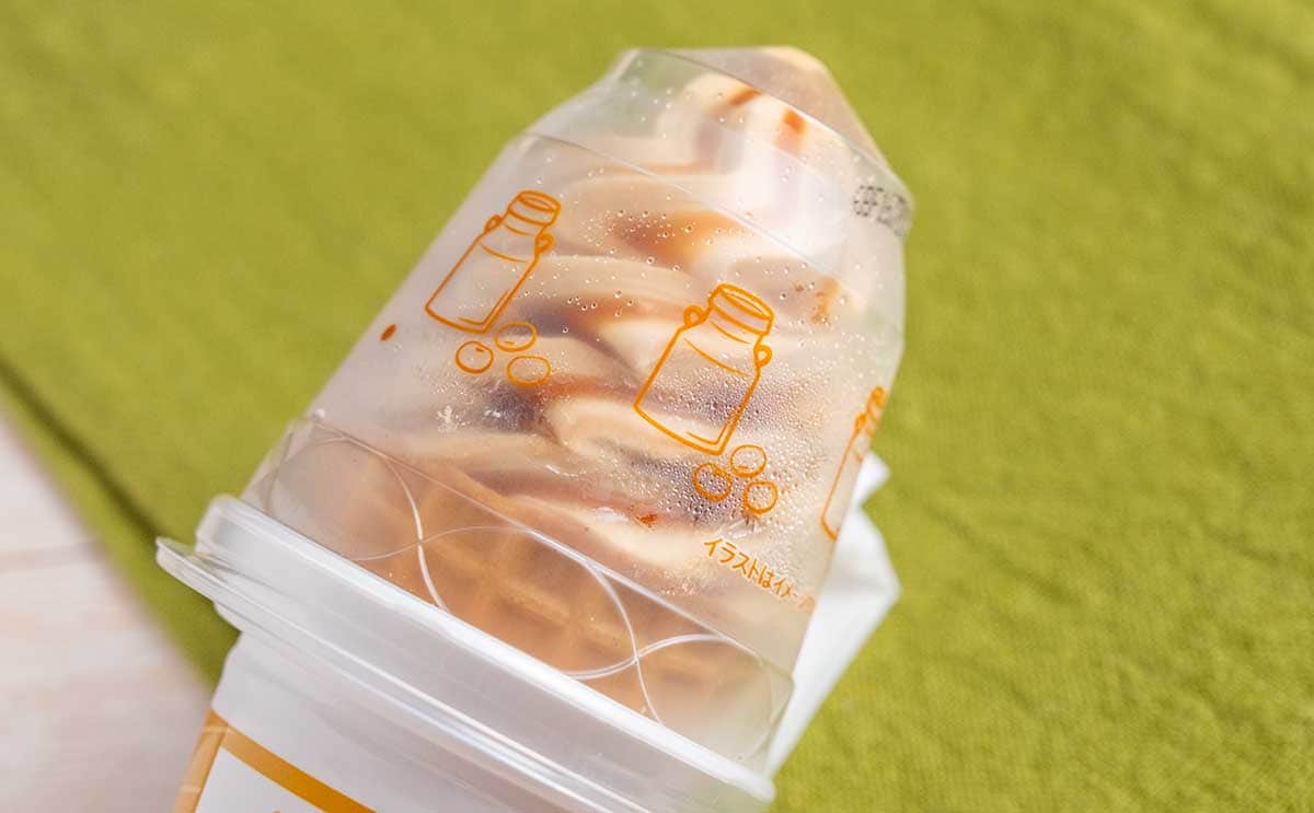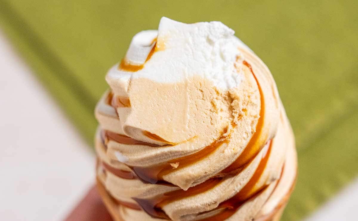 容器から出した瞬間に、きなこの香りが広がるワッフルコーンは、本当にやさしい味わいで最高! きなこの香ばしい風味を感じるアイスと、リッチミルクのまろやかでクリーミーな味わいのアイスに、風味豊かなコク深い黒蜜ソースがよくマッチしています。ザクザクとした食感のワッフルコーンも◎。隠し味に“食塩”を使っているため、アイスの甘さときなこの風味が引き立ち、“和”の味わいを堪能できる仕立てとなっていますね。これは本当においしい!