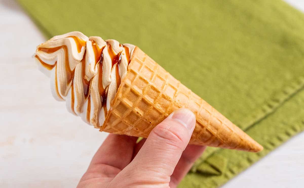 セブンプレミアムの人気アイス「ワッフルコーン」の新作は、香ばしいきなこアイスと、コクのあるリッチミルクアイスに、黒蜜ソースを巻き上げた、きなこみるく味となっています。