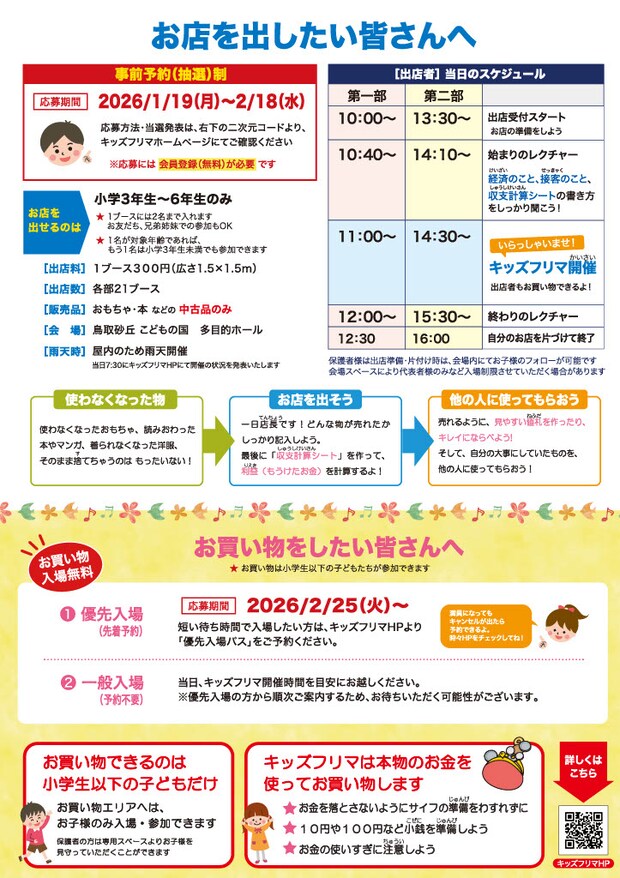 物の売り買いを通して、お金を稼ぐ「商売」の面白さや、物を大切にするリユースの意識を身につけることができますよ!お買い物ができるのは小学生以下のお子様だけです!保護者の方は専用スペースよりお子様を見守っていただくことができます!参加方法は優先入場と一般入場の二通り!詳しくはHPをご確認ください!