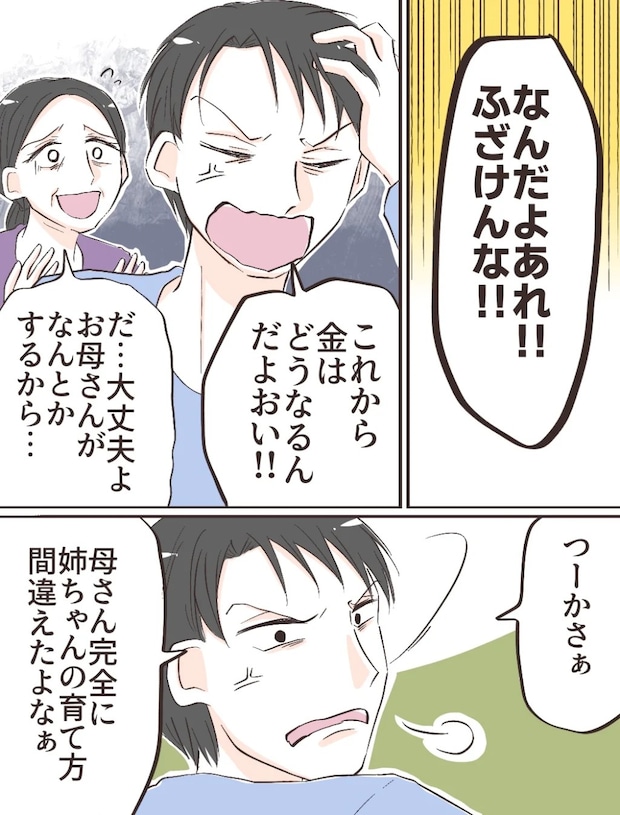 その頃実家では、「なんだよあれ、ふざけんな!これから金はどうなるんだよ!」と荒れに荒れまくるカズキ。そんな彼を見て、母は慌てて「大丈夫よ、母さんがなんとかするから」と子どもをあやすように声をかけます。するとカズキが振り返り「つーかさぁ、母さん完全に姉ちゃんの育て方間違えたよなぁ」と呆れながら言いました。
