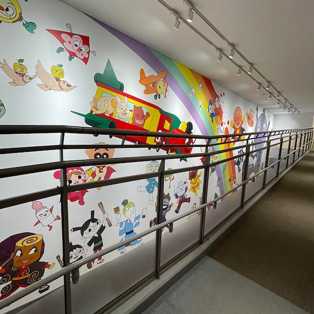 ミュージアム入り口は2階にあります。虹色の階段を上り、通路にはキャラクターが描かれていました👀